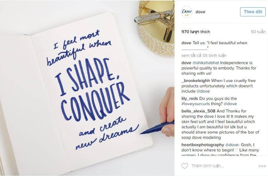 Dove is a very successful beauty brand when it comes to creating a positive, friendly, and love-filled atmosphere for their fans on social media networks. Most of the Dove posts on Instagram are for the purpose of motivating girls and women to pay more love for themselves; their messages and interaction are also created to inspire people to follow this idea.