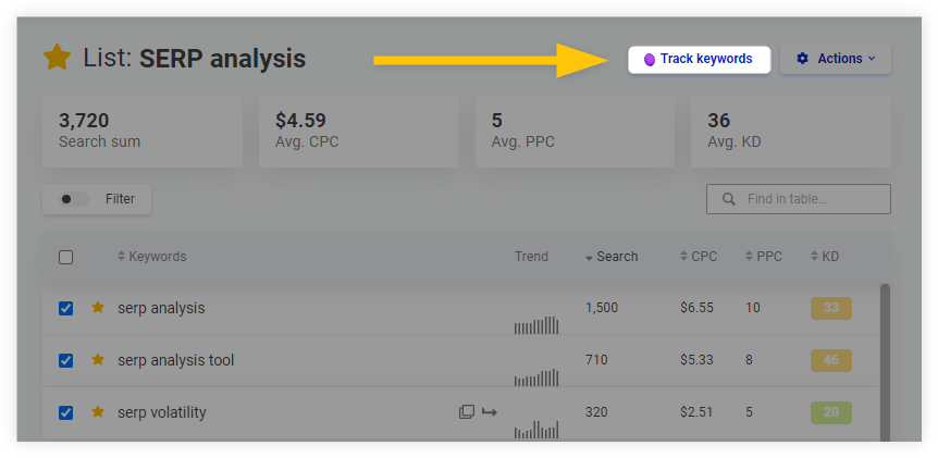 You can head over to the “Lists” tab with your researched keywords (or simply start a new keyword list), select all the important keywords that you need to keep an eye on, and hit the “Track keywords” button.