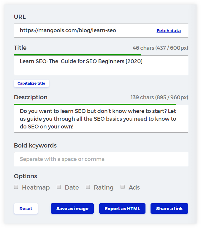 Tip: You can write and test your title tags and meta descriptions in our free SERP Simulator tool and see the simulation of your snippet in Google Search: